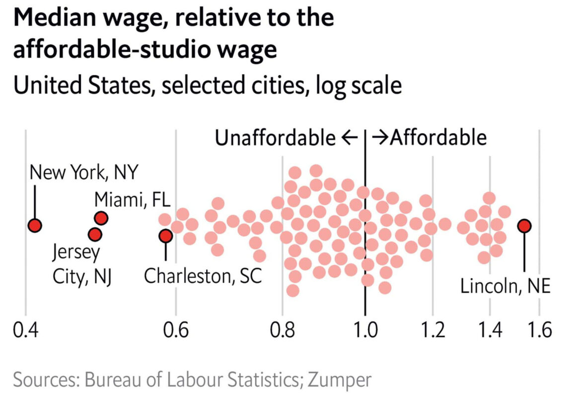 Over the past 20 years rising rents have outpaced wage growth in America. According to Moody’s, a financial services company, the average share of household income spent on rent hit 30% in 2022, its highest proportion in at least 25 years. That means the average American household is now classed as “rent-burdened” (defined as paying more than 30% of gross salary on rent). For city dwellers, particularly those who wish to live alone—as Carrie Bradshaw, the protagonist of “Sex and the City”, did in New York—finding affordable housing is particularly challenging. By our calculations, in some cities, even the humble studio apartment is well beyond the means of the average worker.